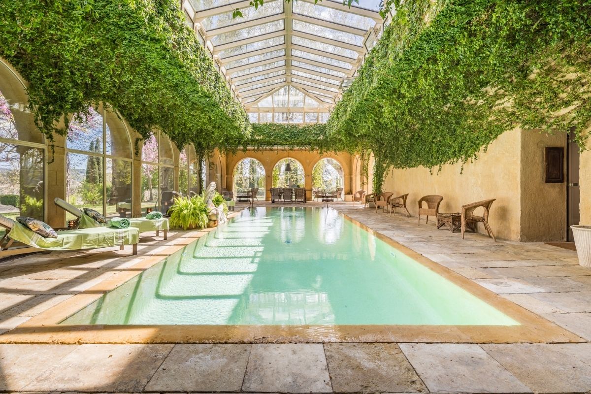 Indoor pool within the historic Orangerie. Outdoor infinity pool overlooking vineyards and hills.