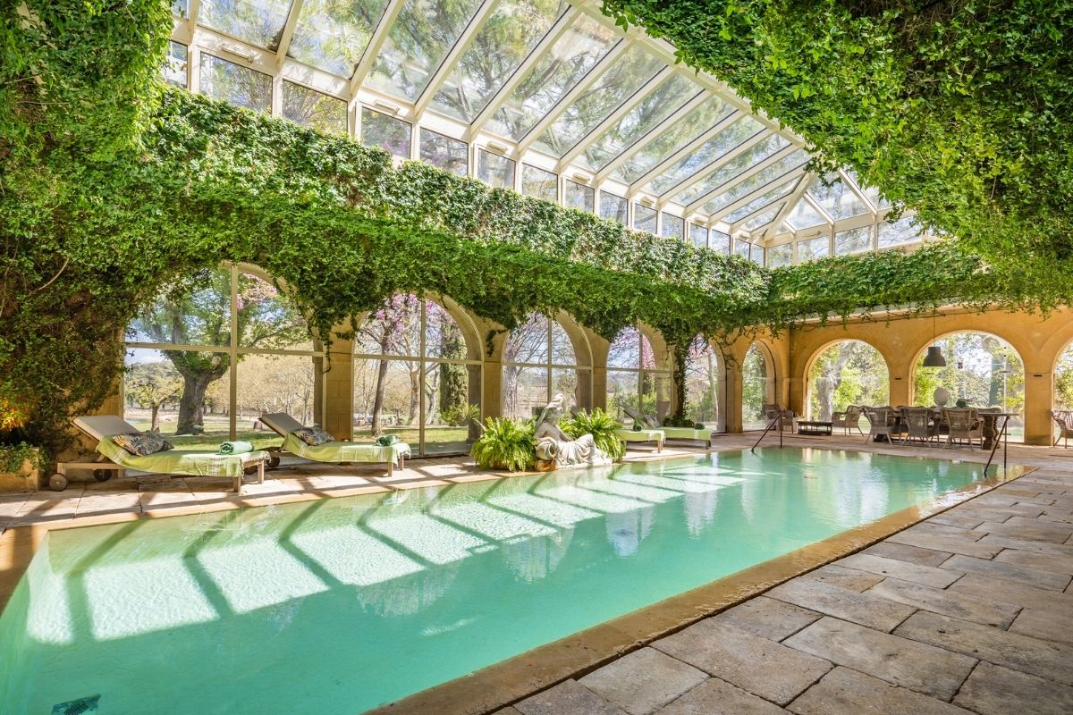 Two extraordinary pools define outdoor life here. The indoor pool occupies the historic Orangerie, where original stone walls and tall windows create a uniquely atmospheric swimming experience year-round. The outdoor infinity pool captures sweeping views of Luberon hills, vineyards, and lavender fields.