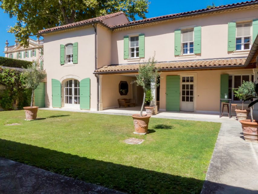 The farm building adjacent to the castle extends over 950 square meters with its patio offering different spaces to settle around the lawn, budding olive trees, citrus trees, climbing jasmine and a fountain.