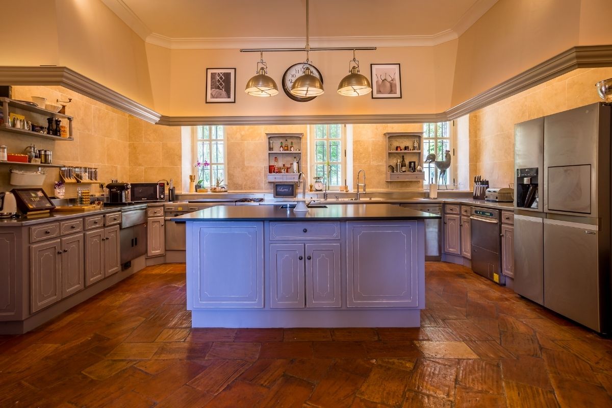 The professional kitchen with cave à vins supports casual family meals and grand catered celebrations alike. Modern conveniences blend discreetly—satellite TV with Netflix and BeInSports, Sonos sound system, fresh sparkling water dispenser. A billiards room offers entertainment, while ample spaces throughout both buildings allow groups to gather or find privacy.