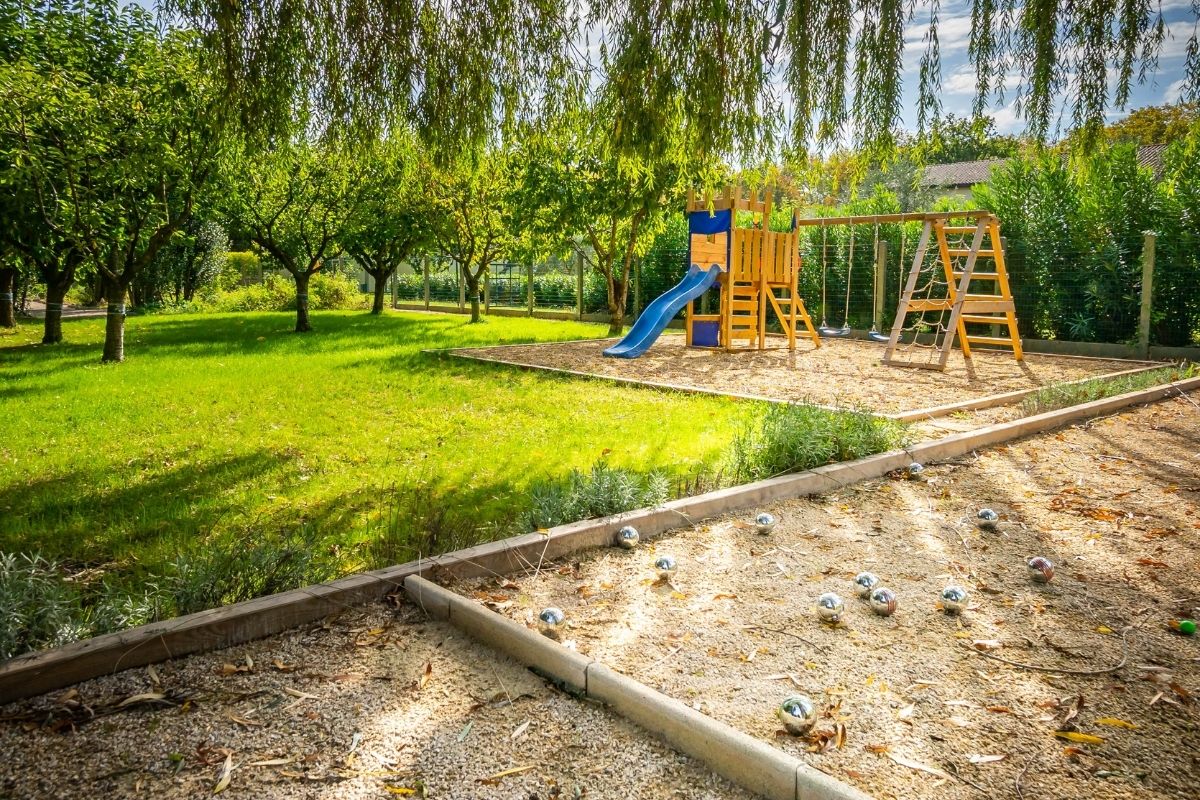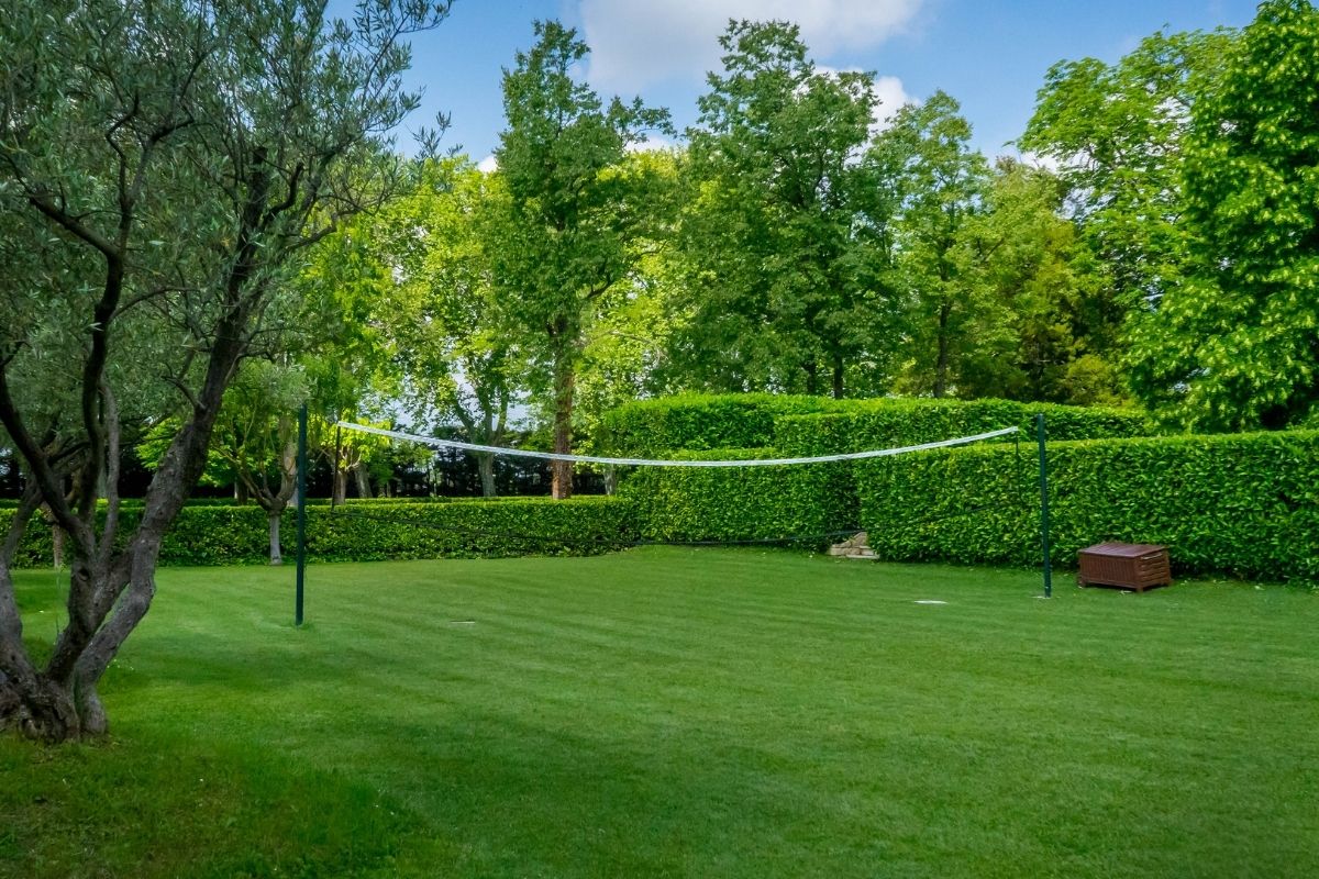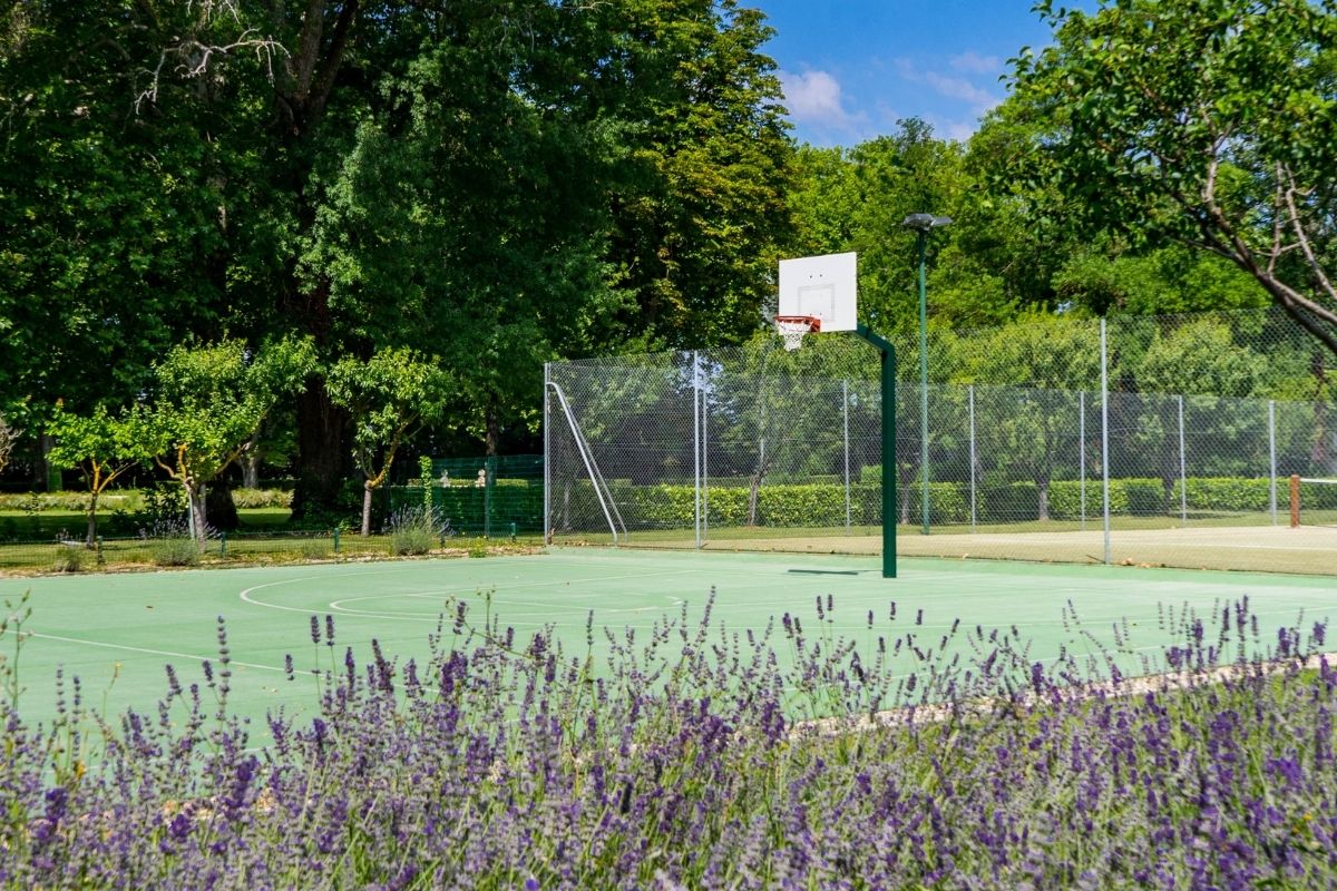 The adjacent covered dining pavilion seats up to twenty-nine guests, with a fully equipped summer kitchen and barbecue for long al fresco meals. Beyond the pool area, the estate’s sports facilities invite active days: lit tennis and basketball courts, squash, volleyball, badminton, and terrain de boules.