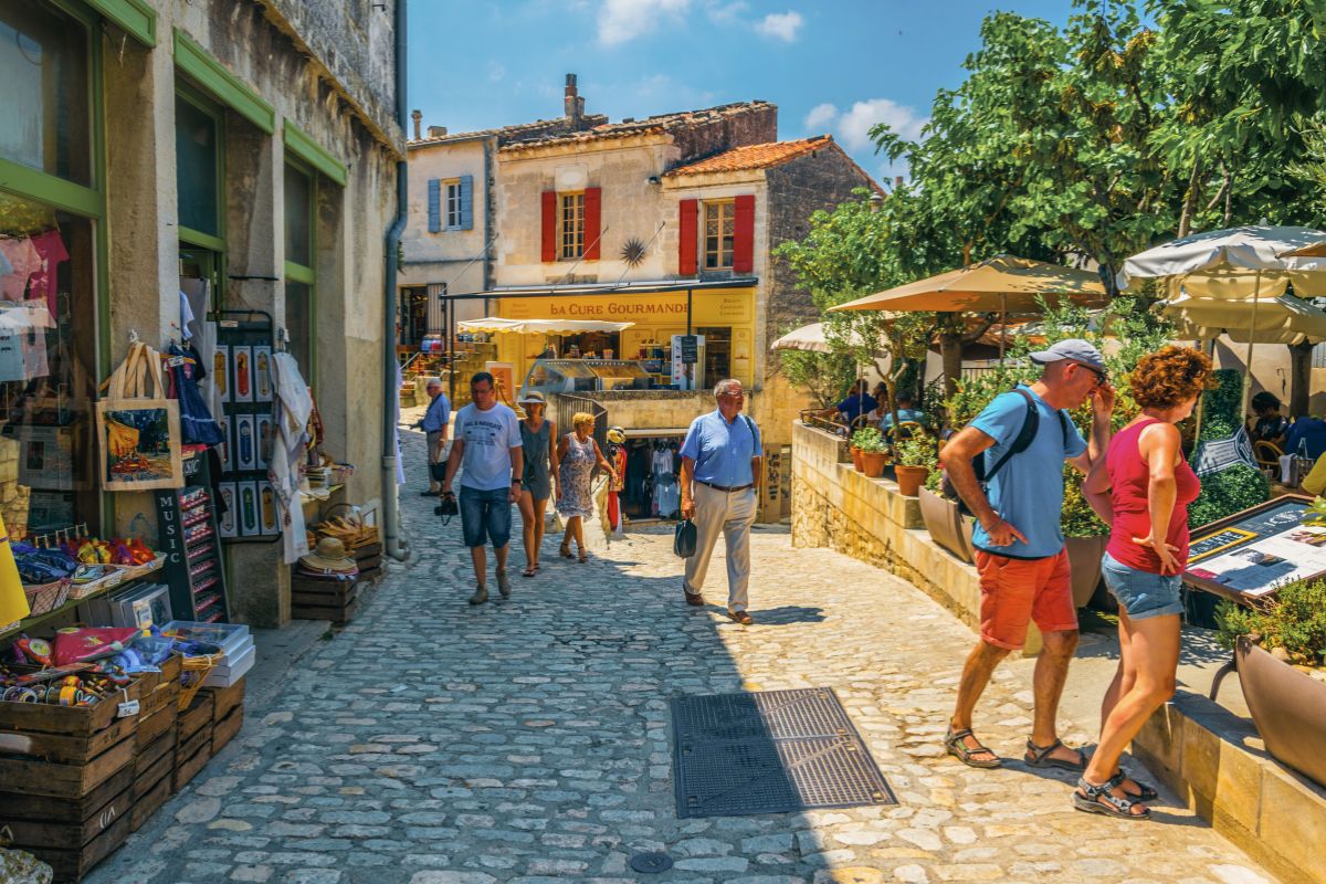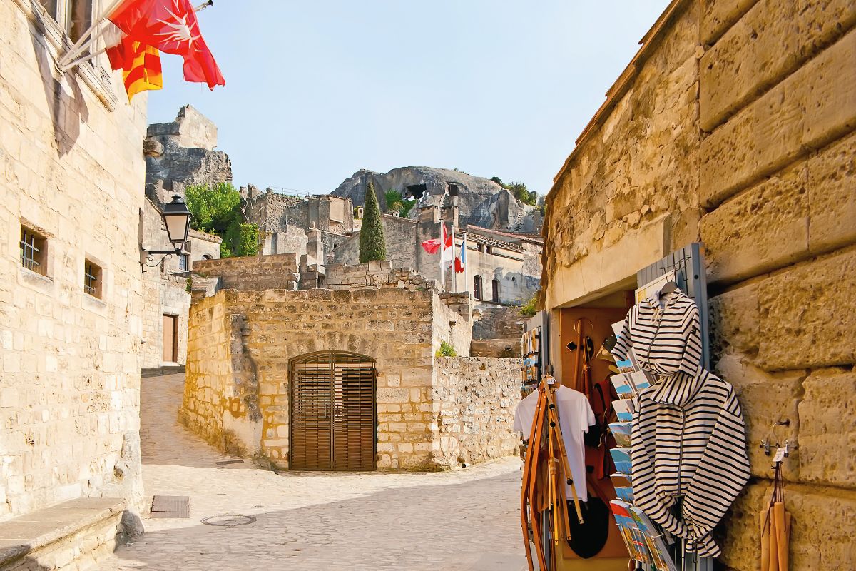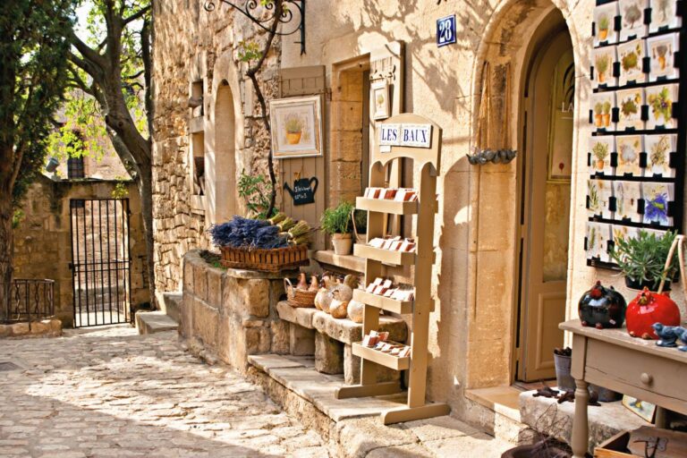 Set atop a rocky plateau, the village rises above olive groves and limestone peaks, with stone houses clustered along narrow pedestrian lanes. The ruins of its medieval fortress dominate the skyline and create a powerful sense of history the moment you arrive. Views from the ramparts stretch across the plains toward Arles and beyond, giving the village a grandeur unlike any other place in Provence.